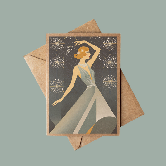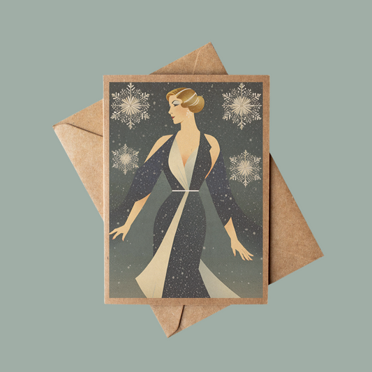 Brown Kraft Paper Vintage Art Deco Style Woman Snow Flakes Christmas Card