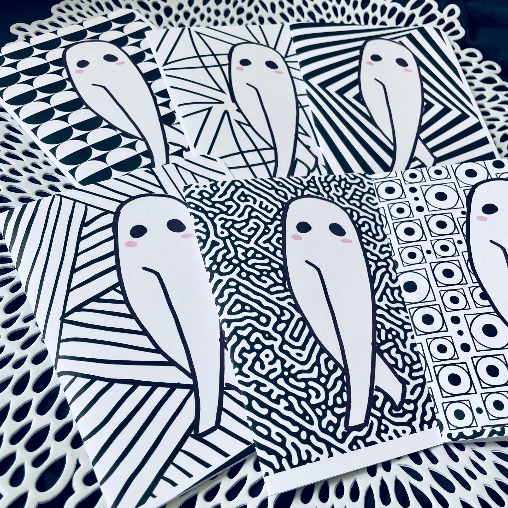 Set of 6 black and white pop art Fresno Nightwalker cards + envelopes.
