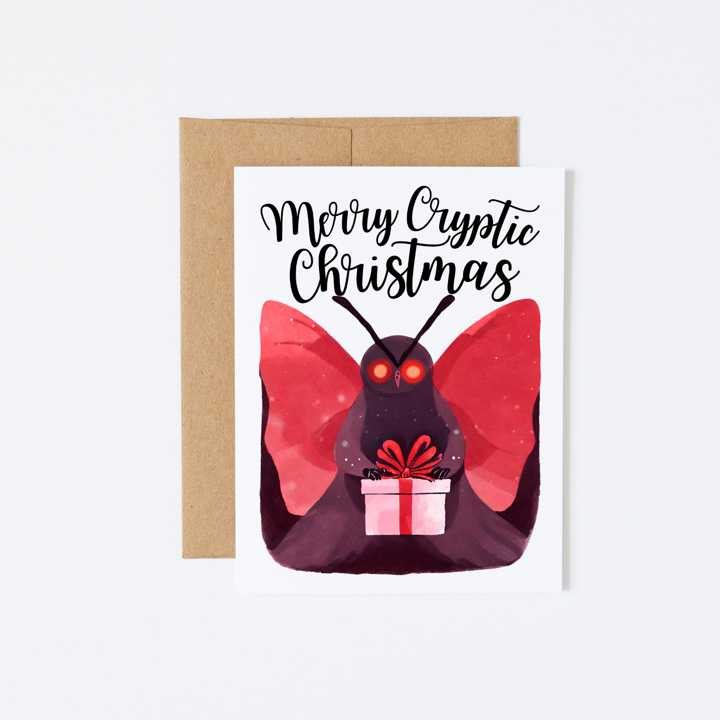 A watercolor illustration of a cute Mothman cryptid holding a Christmas present and the caption “Merry cryptic Christmas”