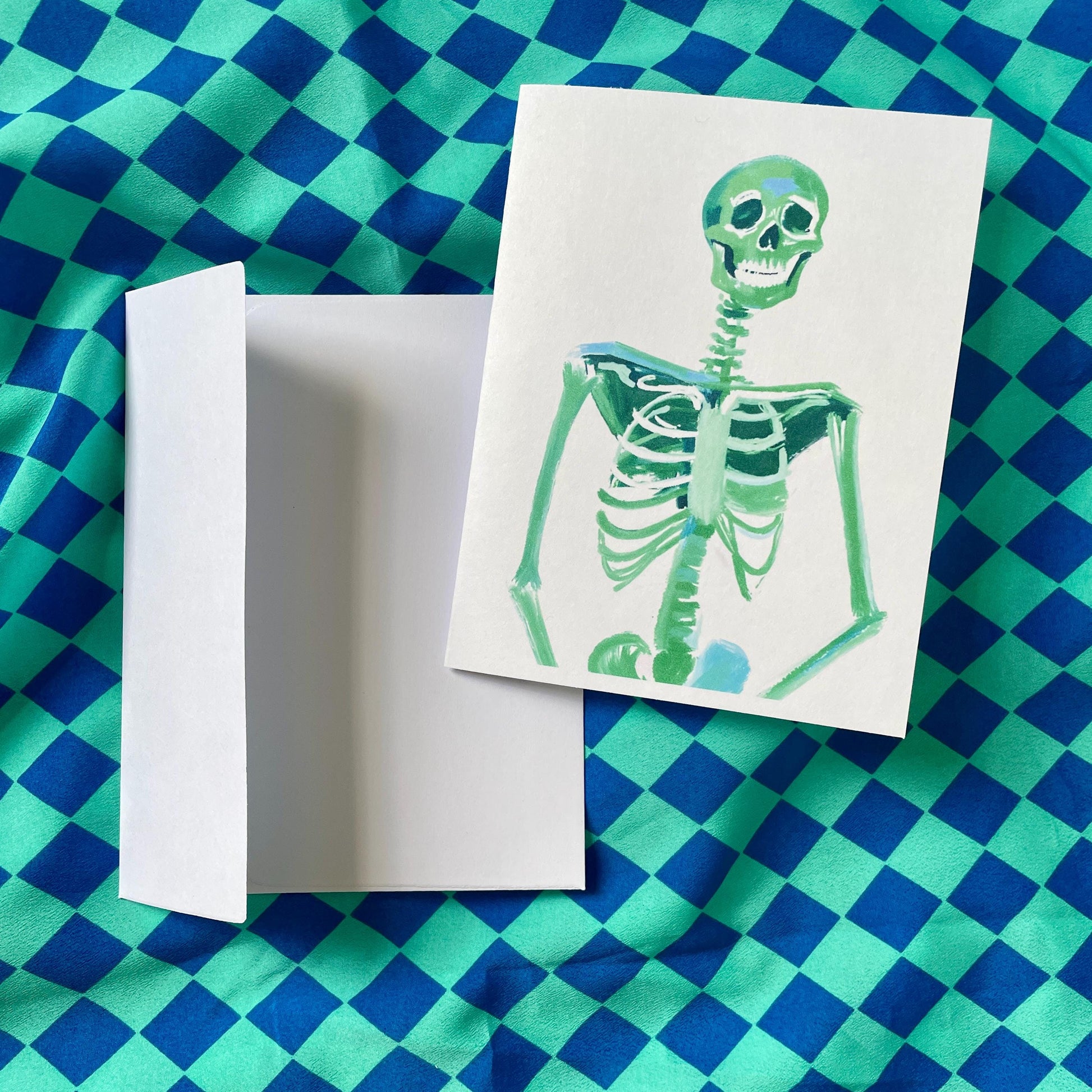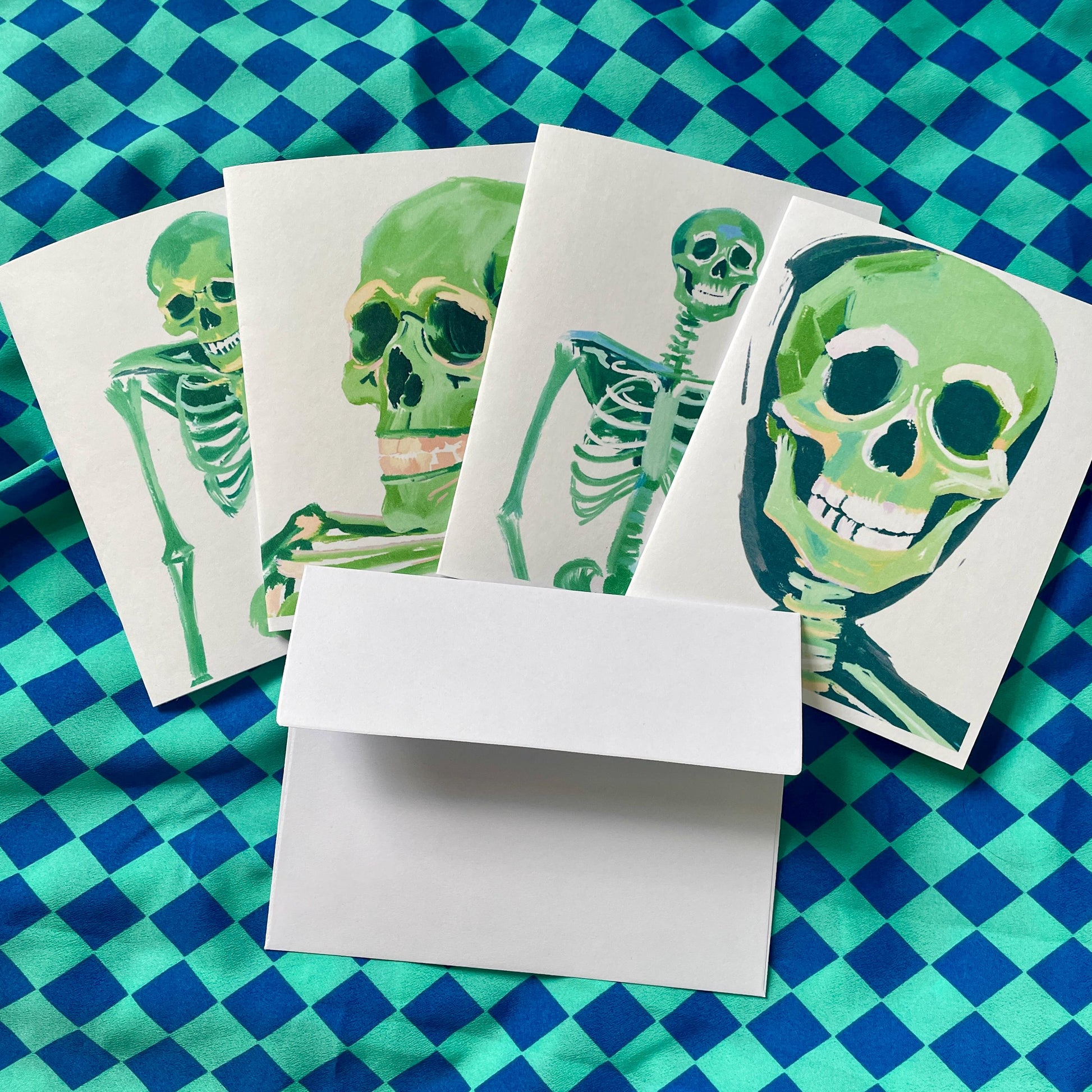 Set of 4 Bright Neon Green Skeleton Greeting Cards